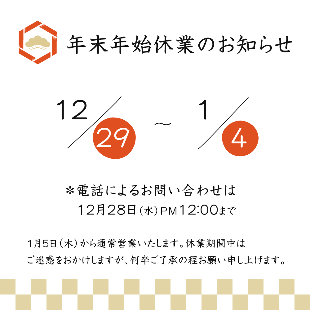 平素は格別のお引き立てに賜り厚く御礼申し上げます。 年末年始の休業期間についてご案内させていただきます。