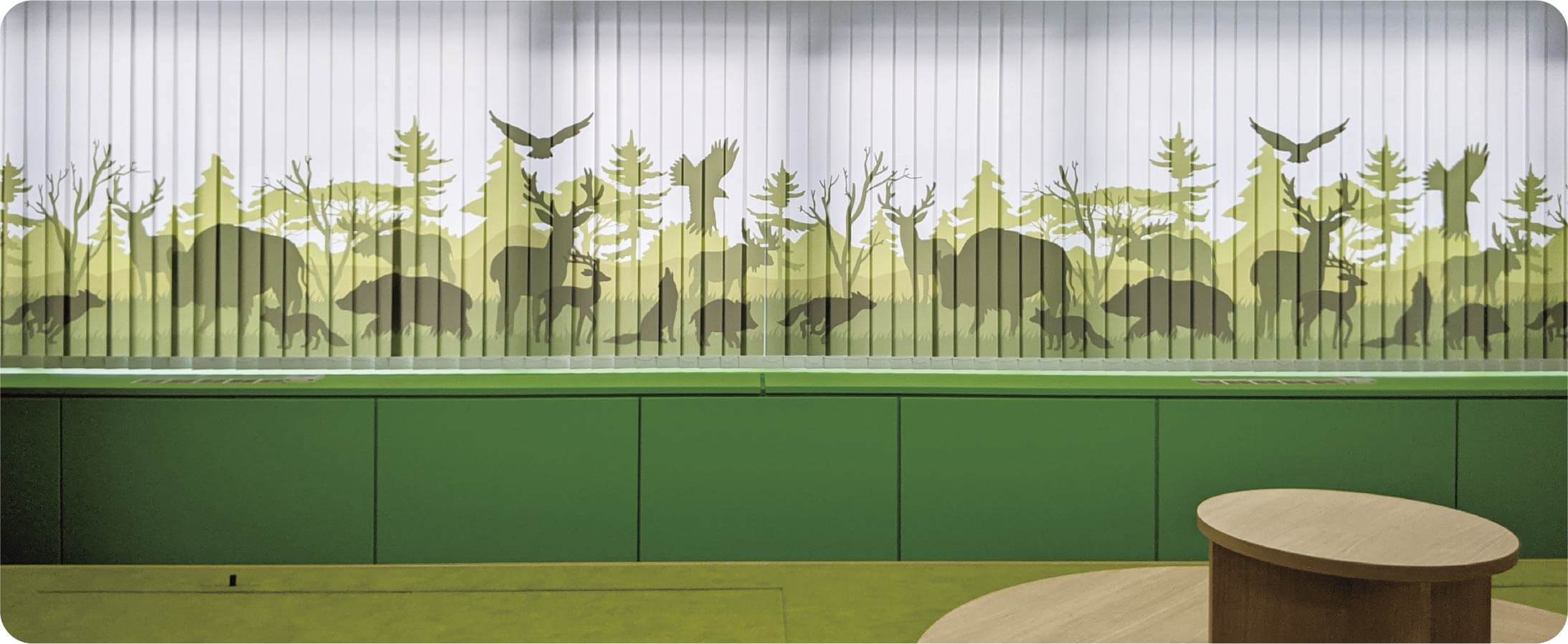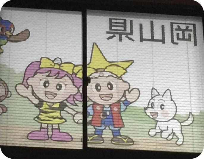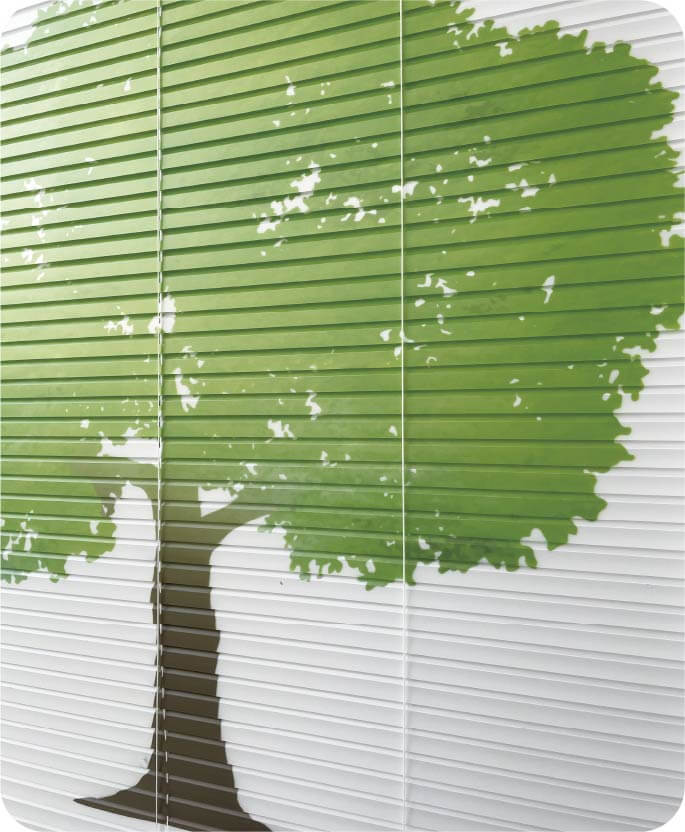 アカリナCはスラット(はね)に直接プリント可能。ロゴ、写真、イラストなどを印刷して、世界に1つだけのブラインドを製作できます。ミルキーシリーズは透過拡散性能が高いため、夜間は内照式看板のようにプリントをハッキリと浮かび上がらせます。