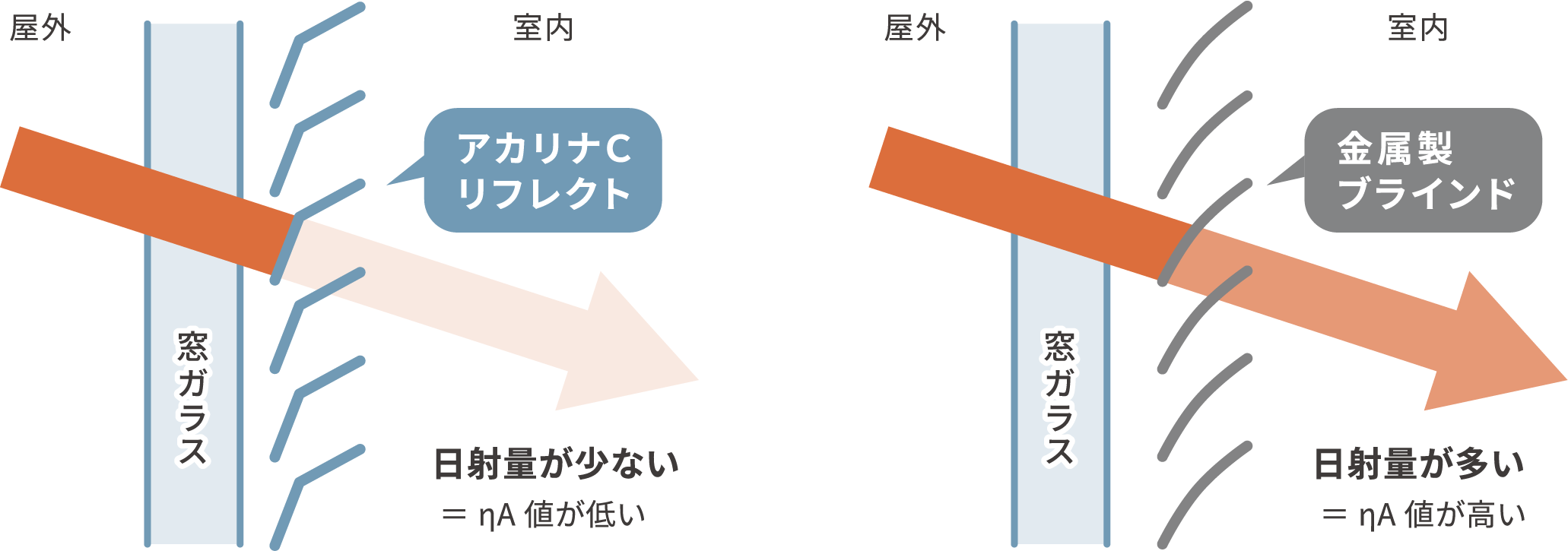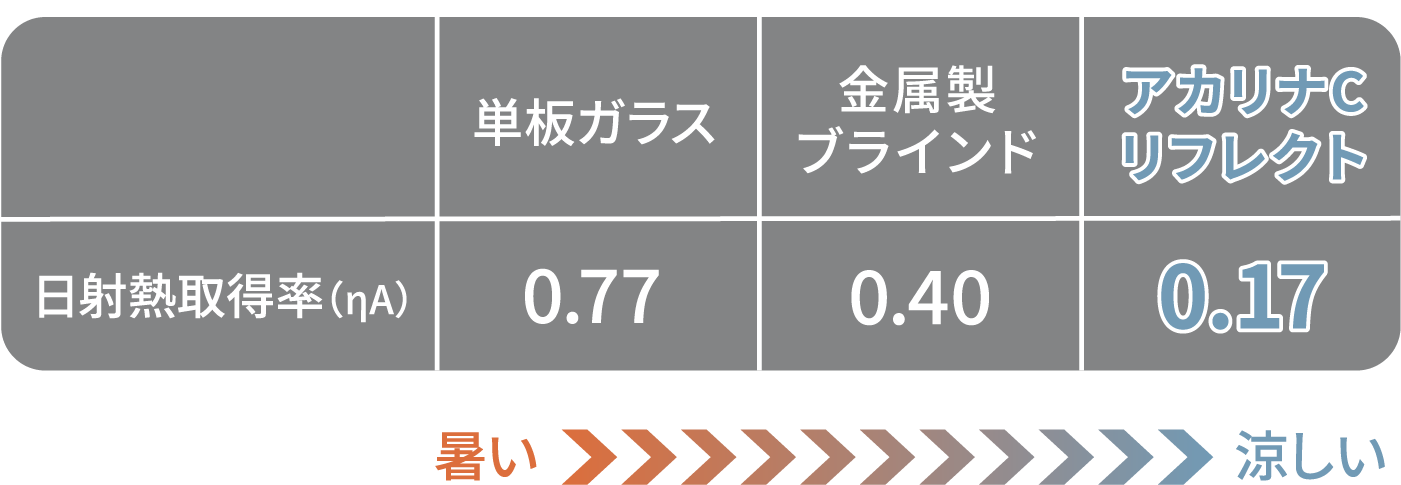 遮熱性能を示す日射熱取得率(ηA / イータエー)は、太陽光がどれだけ室内に取り込まれるかを表す指標です。主に窓に求められる性能を示し、室内に入る日射量を外皮などの面積で割って算出するため、数値が小さいほど太陽光による熱の侵入を抑えられます。アカリナC リフレクト ヨコ型は日射熱取得率が0.17※1という非常に低い値で室内の温度上昇を抑えます。